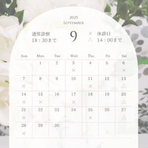 Categories お知らせ 9月の診療予定表について Post author By KMRクリニック・スタッフ Post date 2025年8月25日 当院は第1・第3水曜日、第2・第4木曜日、日曜祝日が休診日となります。 美容施術は医療行為ですので、初回は医師の診察を経てからのご案内となります。 ご了承くださいますようお願いいたします。 臨時休診のお知らせ 開院1周年のご挨拶